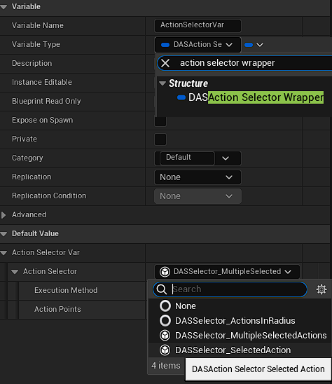 Update Notes 6th June 2022 Added new variable type ActionSelectorWrapper which allows to create instanced ActionSelector object in blueprints. Added optional Source Actor Location to DASSelector_ActionsInRadius Minor code changes