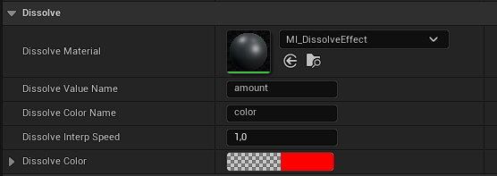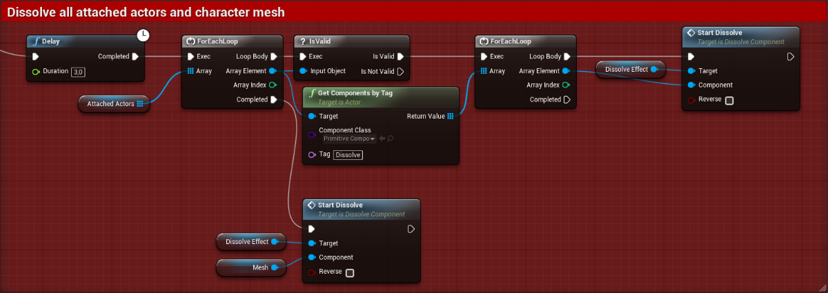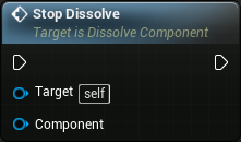This function starts dissolve effect on character mesh and all attatched actor components with tag Dissolve