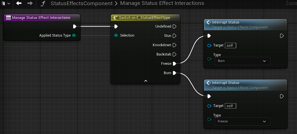 This function is called when status effect is applied, and we could add custom logic there to for example remove frozen status effect if burning is applied.