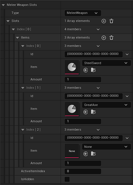 item that is currently equipped is defined by ActiveItemIndex and it can be changed in runtime, which will allow owner to switch from Steel Sword to Great Axe -