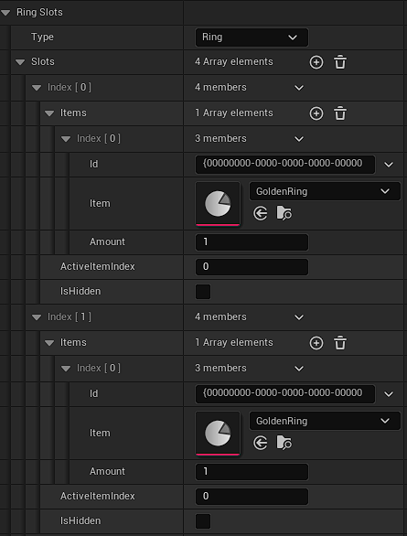 - ActiveItemIndex is set to 0 ( red background ) in both slots which means that both rings are equipped and gives owner bonuses