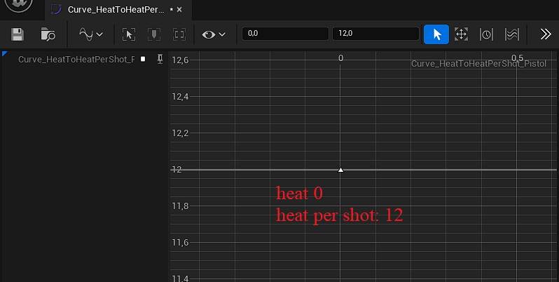 Pistol has only 1 point in curve, it means that each shot will add 12 heat even if we just started shooting ( heat was 0 ).