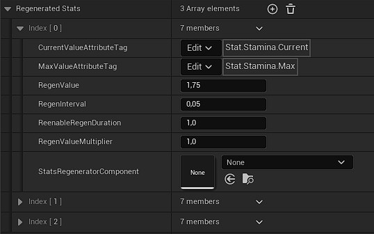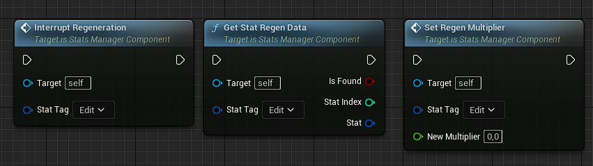 Stats regeneration logic is kept in separate StatsRegeneratorComponent that is spawned in runtime and should never be accessed directly, only through StatsManagerComponent.