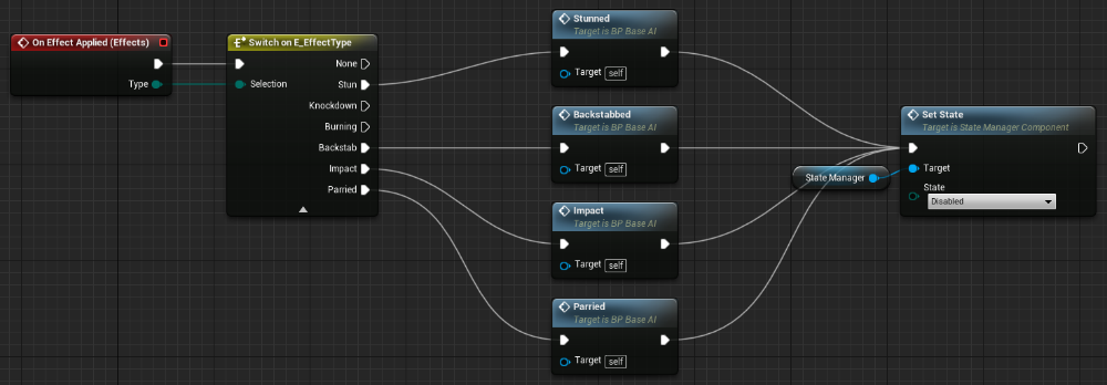 When stun effect is applied, AI will activate function Stunnned and set it’s state to Disabled etc.