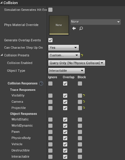 Let’s take a look at collision settings of Collision Box in PickupActor.