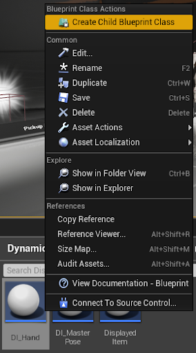 Obviously we want to create blueprint based on DI_Hand, since our sword will be equipped to hand.