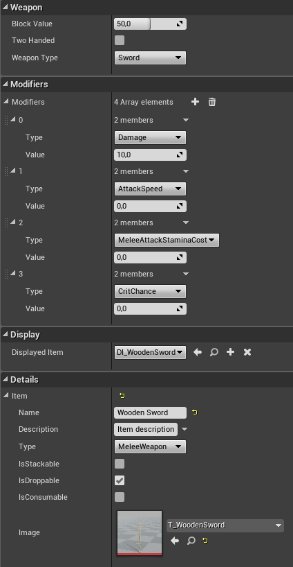 By default there are 4 modifiers, but you could add more like Health bonus etc. - DisplayedItem - class of item that will be displayed when this sword is equipped
