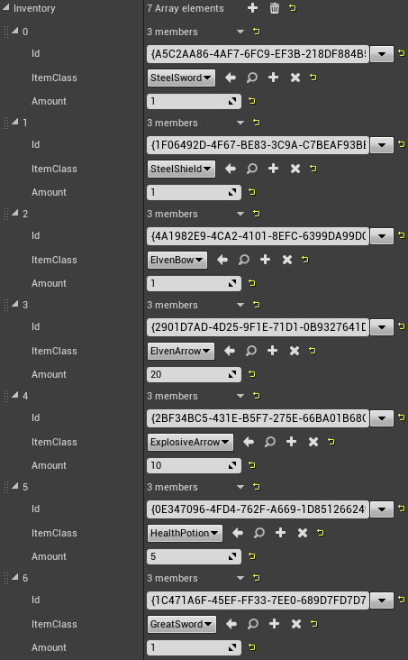Starting Items To add new items to InventoryComponent, add new elements to Inventory array. Generate Id, set item class and amount to value greater than 0.