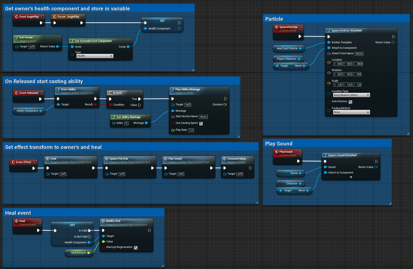 AbilityEffect function in turn is calling Effect function from ability, which heals the owner, spawns particle, plays sound and consumes mana.