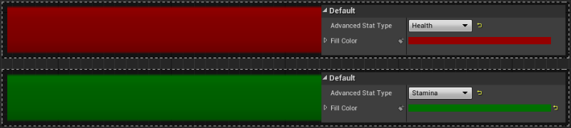 For player it’s simple to setup stat bar widgets, because he uses it in widget blueprint (WB_InGame), so all we have to do here is set AdvnacedStatType value to Health / Stamina and set FillColor.