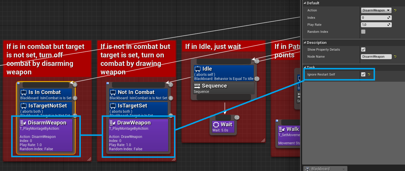 Checked checkbox Ignore Restart Self for DisarmWeapon and DrawWeapon Tasks.
