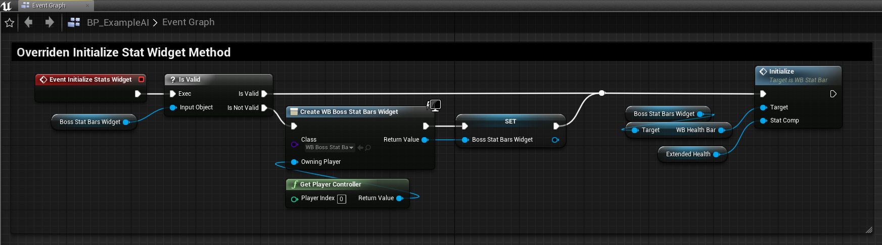 2. Open BP_ExampleAI and override InitializeStatsWidget (right click on event graph -> type EventInitializeStatsWidget).