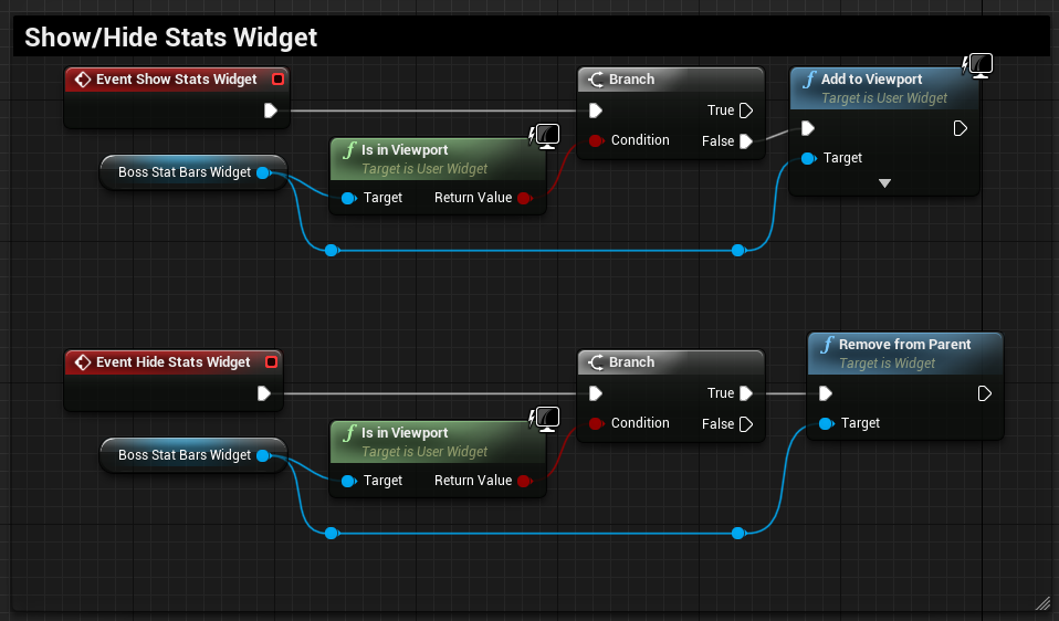 3. Override events (also in BP_ExampleAI) ShowStatsWidget and HideStatsWidget (right click on event graph -> type EventShowStatsWidget/EventHideStatsWidget)