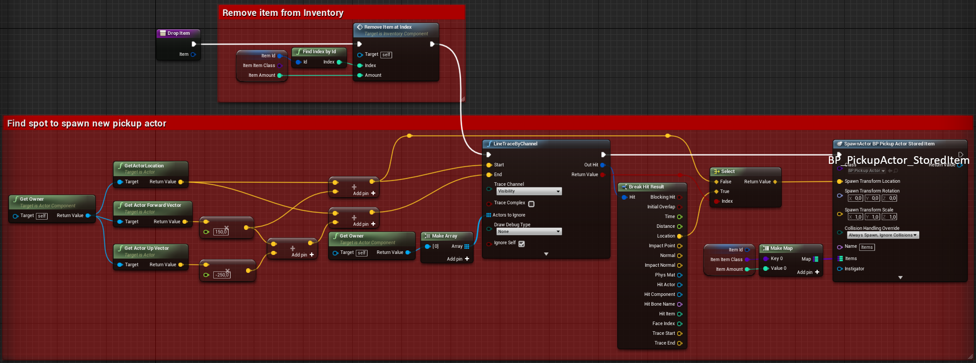 (you could also leave upper graph and change class to BP_PickupActor_Light so items will still be gathering in 1 pickup actor on drop)