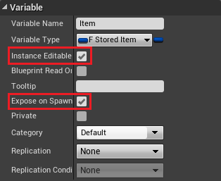 Add variable of type F_StoredItem, name it Item and mark as InstanceEditable and ExposeOnSpawn.