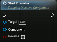 This function starts dissolve effect on character mesh and all attatched actor components with tag Dissolve