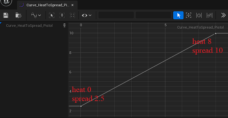 Pistol has only 1 point in curve, it means that each shot will add 12 heat even if we just started shooting ( heat was 0 ).