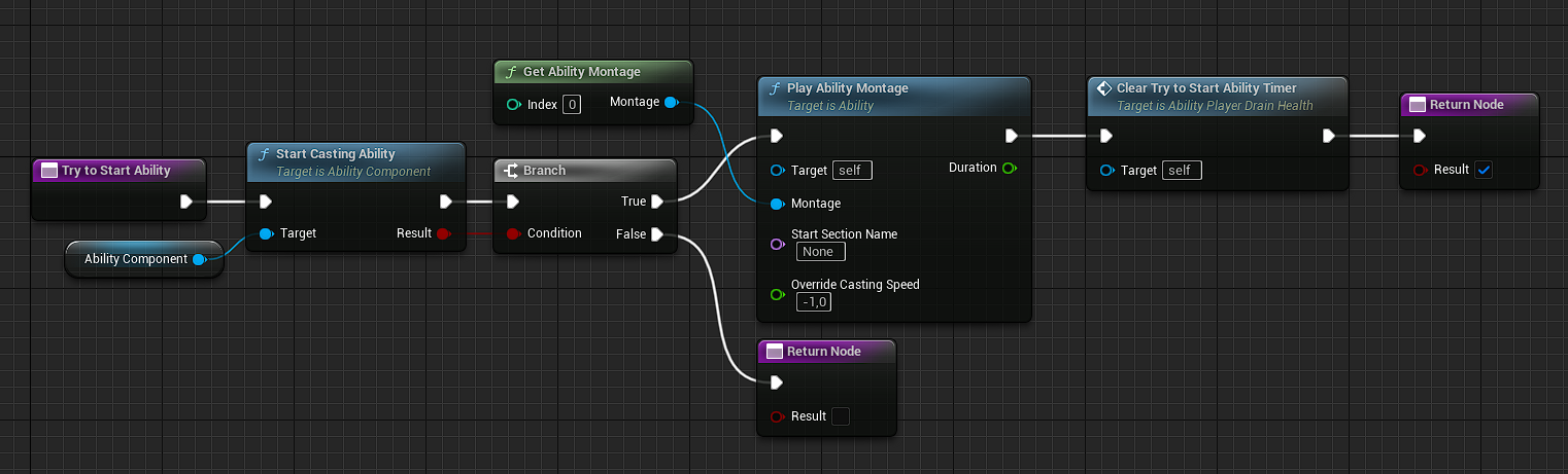 Instead it observes if ability input is released, then it tries to start ability using function from AbilityComponent, if return value was true, then it plays ability montage.