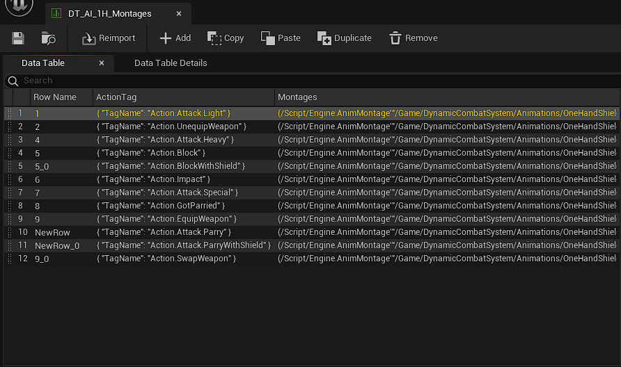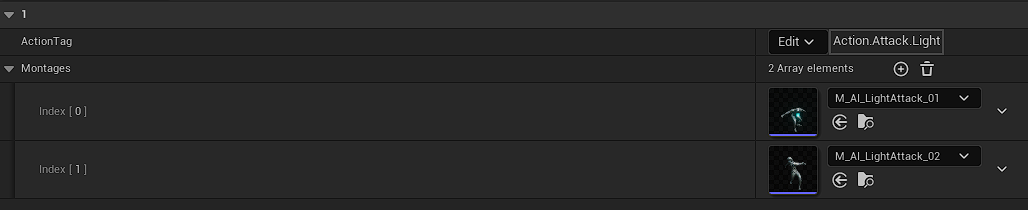 Each Montage Action is made of AnimMontages array and gameplay tag used as identifier.
