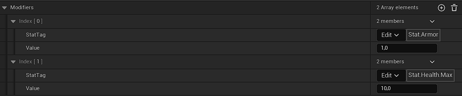As an example let’s take a look at SteelBoots item blueprint, it has array of modifiers that will be applied when this item will be equipped.