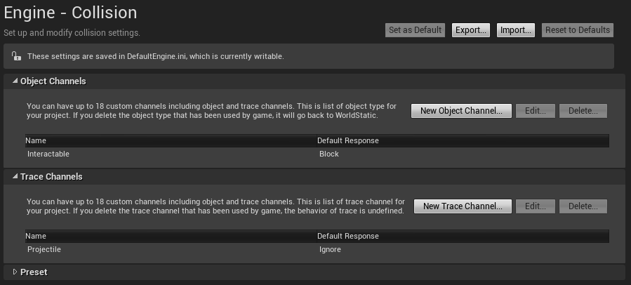Dynamic Combat System is using custom Object Channel called Interactable with default response Block and custom Trace Channel called Projectile with default response Ignore.