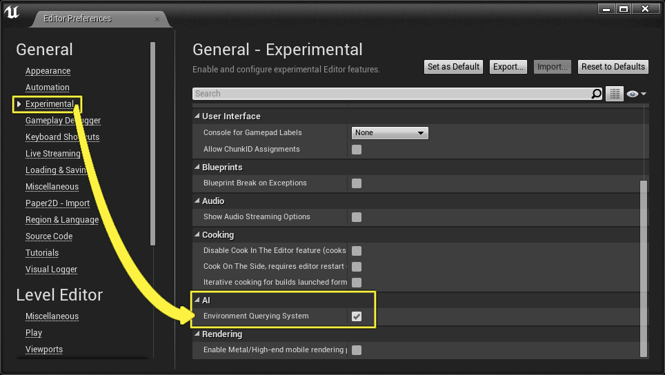 EQS Environment Query System is used by AI, but it is still marked as experimental, which is why it must be enabled in Editor Preferences, otherwise it may generate errors on project startup.