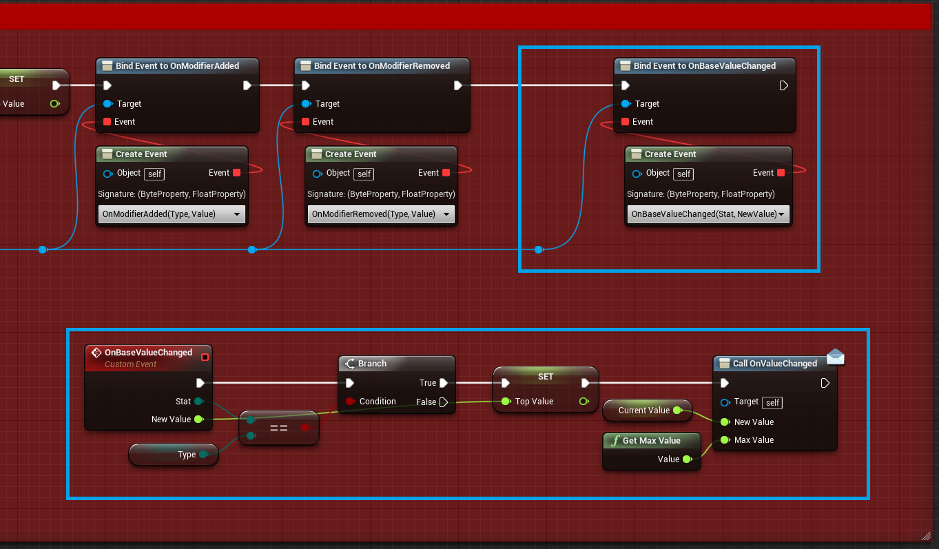 Binded new event to dispatcher OnBaseValueChanged from StatsManagerComponent.