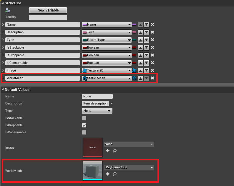 Modify F_Item struct by adding static mesh variable which will be its world representation.