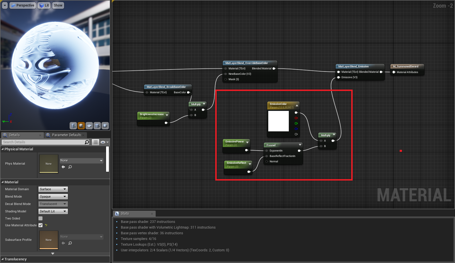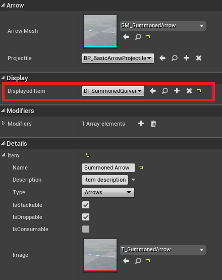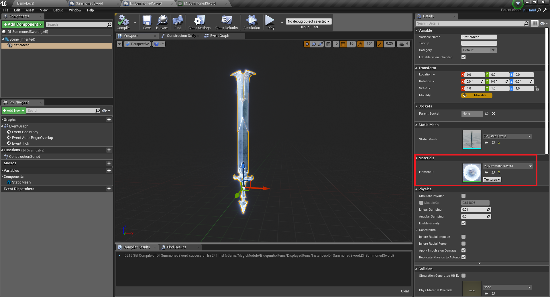 I named new sword blueprint SummonedSword, in its DisplayedItem blueprint as static mesh used SM_SteelSword from DCS, but duplicated its material and modified it to shine.